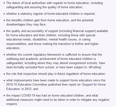 - The duties of local authorities with regards to home education, including safeguarding and assuring the quality of home education;