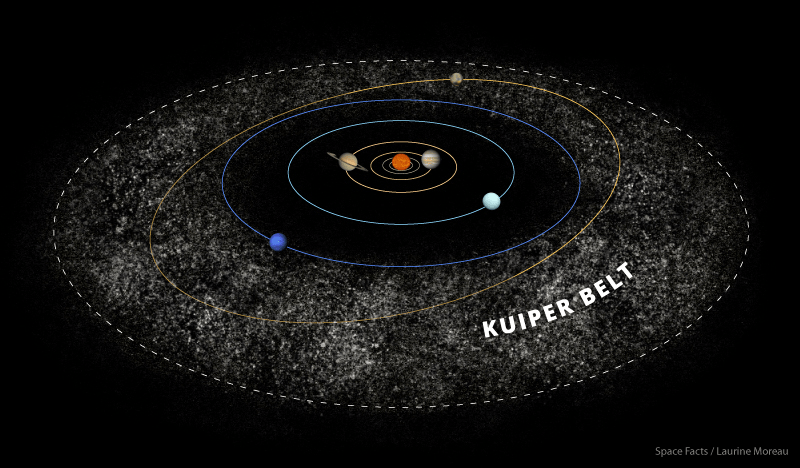 The Kuiper Belt extends from roughly the orbit of Neptune (at 30 AU out to about 55 astronomical units from the Sun. The main body of this belt covers much of this region, ranging from nearly 40 AU to 48 AU. It is thick in most places and astronomers have described it as being more torus-shaped than a belt would be. Other regions of the Kuiper Belt include a disk of scattered objects that are part of a population of