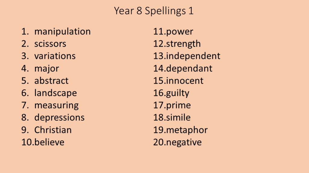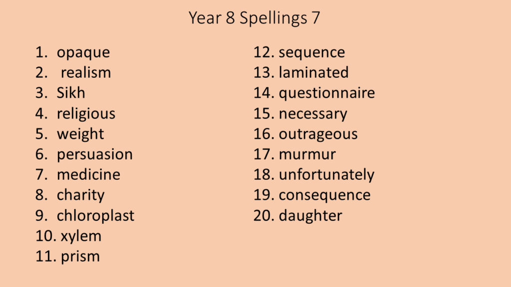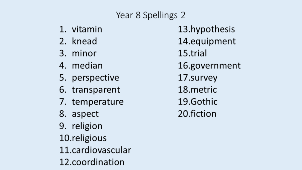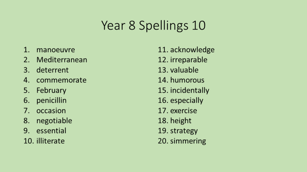 Year 8 Spelling Lists 0 February 18, 2021 Written by uk homeschool Share this: Click to share on X (Opens in new window) X Click to share on Facebook (Opens in new window) Facebook Like Loading... Related