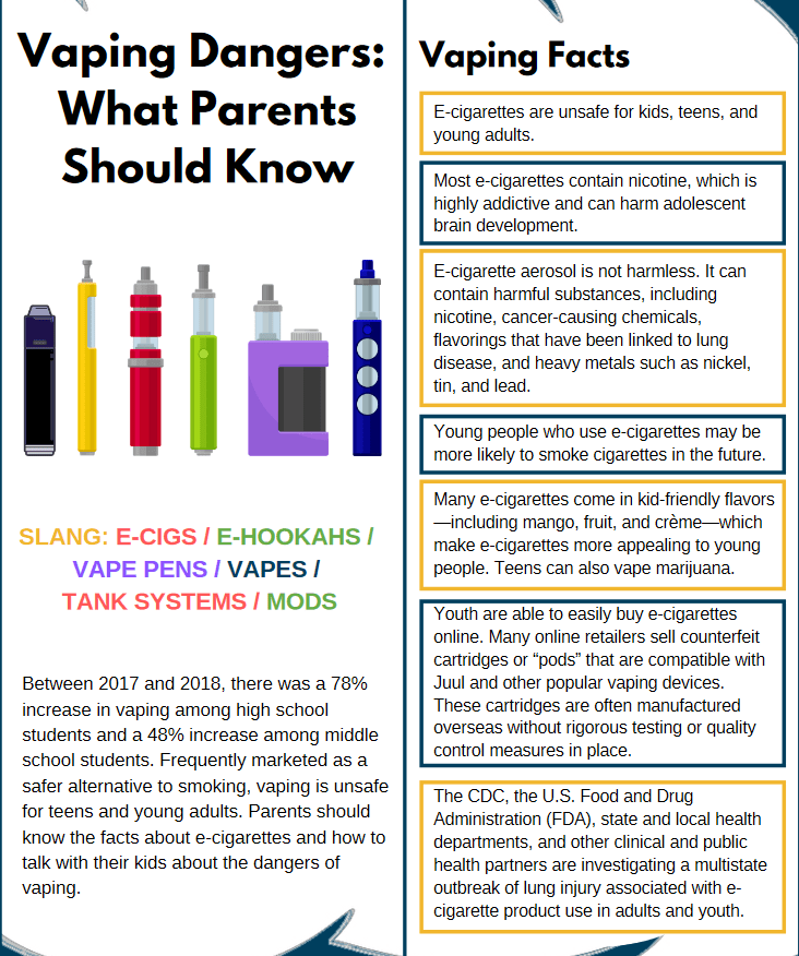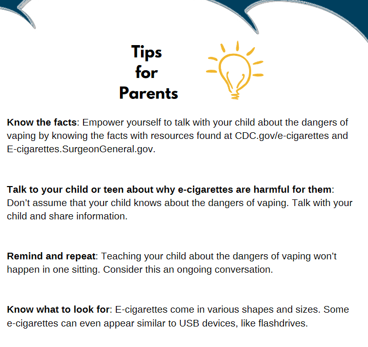 - Know the facts: Empower yourself to talk with your child about the dangers of vaping by knowing the facts with resources found at CDC.gov/e-cigarettes and E-cigarettes.SurgeonGeneral.gov.