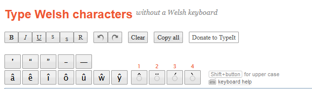 This website allows you to easily type Welsh characters without a Welsh keyboard. You can edit your text in the box and then copy it to your document, e-mail message, etc.