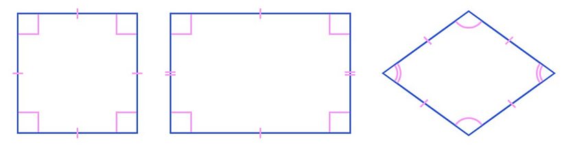 - The rectangle shows 2 sides (top and bottom) with a single hatch mark, meaning those sides are equal in length. It also has 2 sides (left and right) with double hatch marks, indicating that those sides are also equal in length.