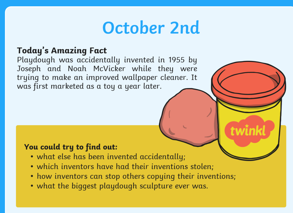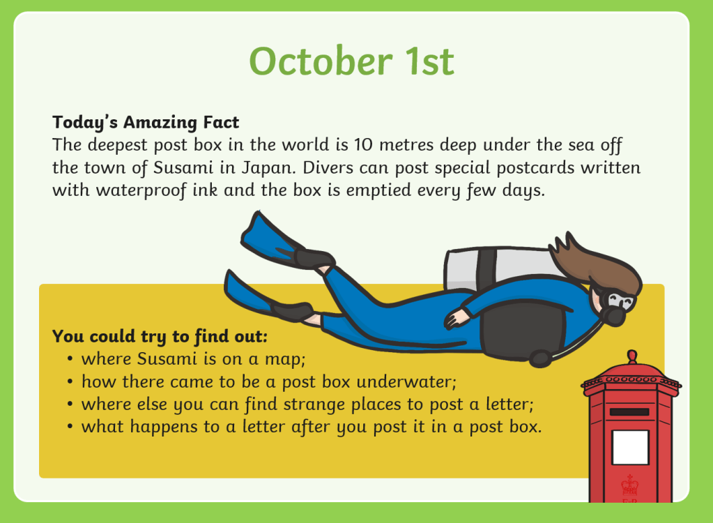 facts of the day Oct 1 – 0 October 7, 2021October 11, 2021 Written by uk homeschool 1-scuba-search-activity-sheetDownload 2-interesting-inventors-activity-sheetDownload Share this: Click to share on X (Opens in new window) X Click to share on Facebook (Opens in new window) Facebook Like Loading... Related