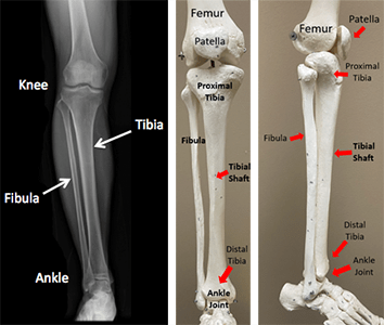 - Tibia: aka shin bone runs from the knee to the ankle, and