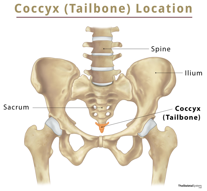 The coccyx (also known as the tailbone) is the terminal part of the vertebral column. It is comprised of four vertebrae, which fuse to produce a triangular shape.