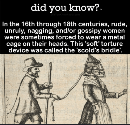 In the 16th through 18th centuries, rude, unruly, nagging, and/or gossipy women were sometimes forced to wear a metal cage on their heads. This ‘soft’ torture device was called the ‘scold’s bridle