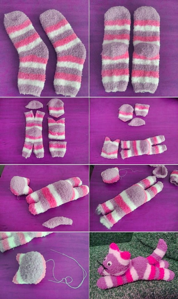 Making sock toys are so sweet and fun. And the most important thing is that you don’t need to have extraordinary skills to make a sock animals because it is already very easy project. If you want to create your sock animal, in this post we want to share a cool tutorial on how to create a little sock kitten. You will need socks, yarn, needle, scissor, filling material and thread, googly eyes and the pattern from below. Start to cut out the parts and gather the body of the kitten. Fill material inside the socks and sew up the body. Create the face by implementing the googly eyes and sew the head in place. And finally you can add the whiskers made out of black thread. When you sew all the parts and you will have the kitten shape and you can decorate it as you wish or create your next sock kittens. Simply amazing!