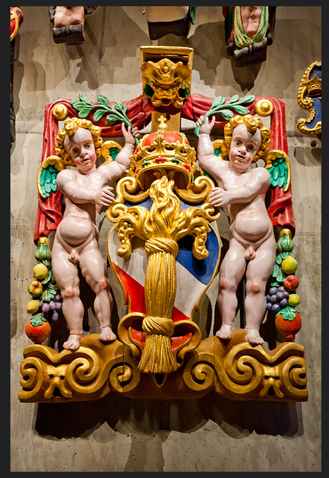 A full-scale replica of a portion of the carving on the stern of the ship, showing the detail and colors that would have been seen when the ship was launched.