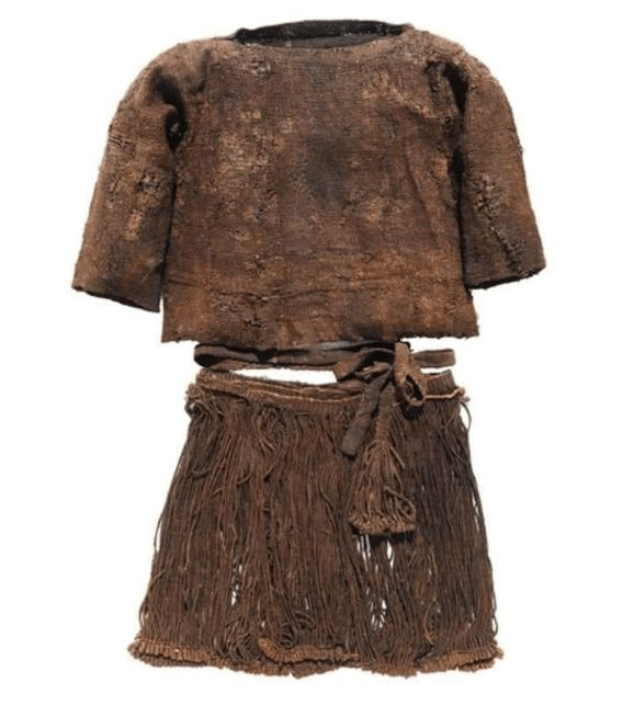 A photo of the remains of a Bronze Age high status female found inside an oak-coffin in a monumental burial barrow at Egtved, Denmark. The Egtved Girl’s garments are extremely well preserved and her exceptional wool costume consists of several wool textile pieces as well as a disc-shaped bronze belt plate, symbolizing the sun.