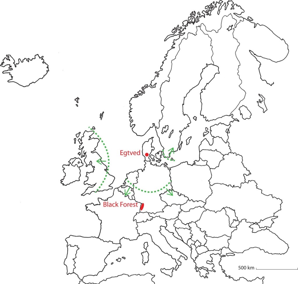 Map showing the location of the Egtved burial site (red dot). Borders of the nearest areas with bioavailable 87Sr/86Sr values that potentially fit the tooth enamel, the child’s bone, wool garments and oxhide belonging to the Egtved find are marked with green lines and arrows. Of these regions the Black Forest area (red ellipse) appears to be the most plausible place of origin as constrained by the multiple strontium isotope codes contained in materials from the Egtved find combined with the archaeological artefact record patterns.